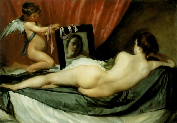 En esta obra Venus está desnuda mirándose en el espejo de su hijo Cupido. En el mito romano Cupido es el dios del amor y la atracción sexual y en el mito griego es Eros y su madre es Afrodita. Velázquez en este cuadro habla de lo que Freud teoriza muchísimos años después: Narciso y Edipo. El Complejo de Edipo y el narcicismo en su doble sentido (apuntalamiento de los progenitores en su hijo y viceversa). El hijo es quién observa la belleza de su madre (¿o de él mismo? el rostro está desdibujado expresamente) en el espejo en que él mismo sostiene, y allí es donde ella reconoce su ser femenino. Cupido apuntala el narcisismo y satisface su deseo de ser él (el dios del amor) quien capture la belleza de su madre Venus.