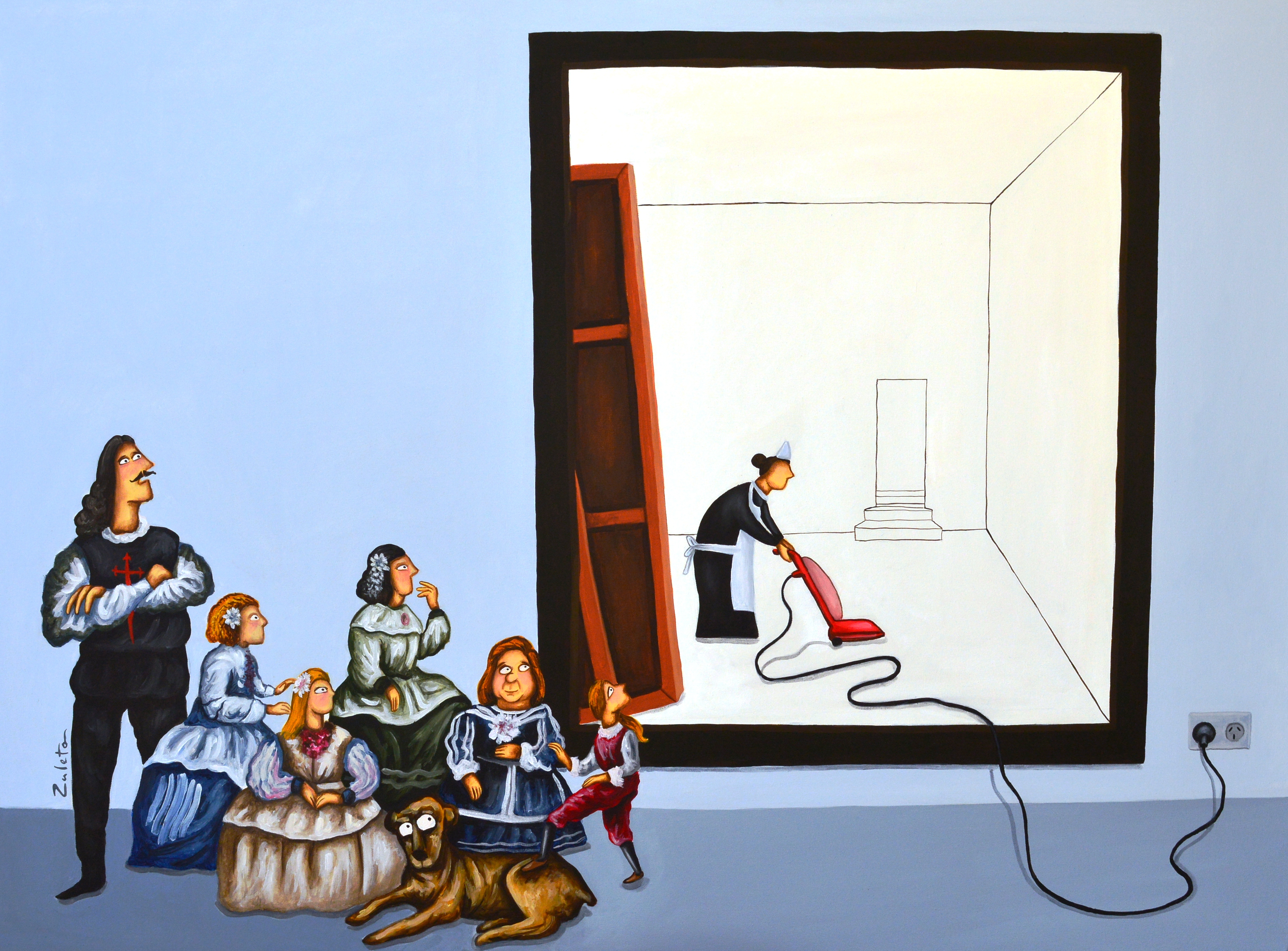 Volviendo al tiempo presente, ya llegada a Buenos Aires, en una muestra en el MACBA, Museo de Arte Moderno de Buenos Aires, realizada por el relanzamiento de la revista “El Gran Otro”, me encuentro con un cuadro de Raúl Zuleta, artista plástico contemporáneo y caricaturista. Zuleta también toma en broma a Las Meninas con una nueva versión que podemos apreciar aquí y que habla por sí misma:
