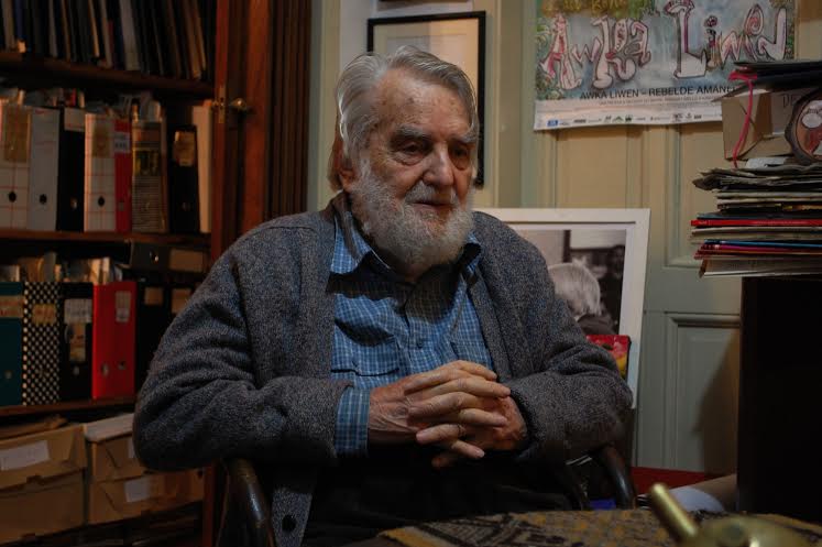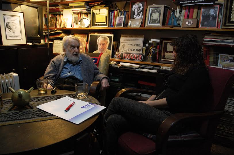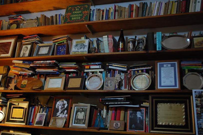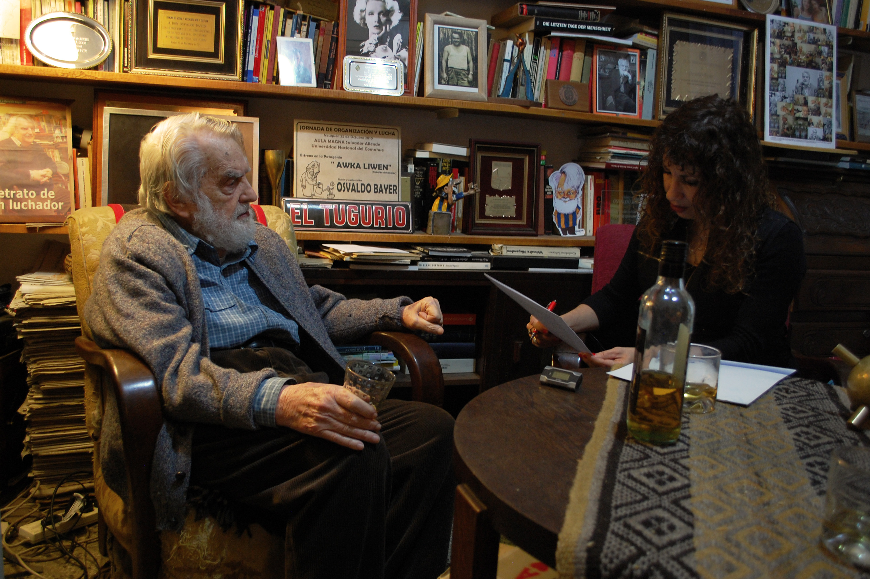 Al llegar a la puerta de su casa, se ve del lado de afuera un pintoresco cartel que dice «Tugurio». Ya la casa respira la calidez y la sapiencia que caracteriza su forma de acercamiento. Una biblioteca llena de libros en español y en alemán, y plena de fotos, cuadros y demás objetos que transportan el halo de sus recuerdos. La conversación es fluida, espontánea y amena, se desarrolla desde el comienzo como una charla entre amigos. Le presento al fotógrafo y le pide que le saque fotos tan buenas como las de Página 12. Las muestra con orgullo. Luego, nos hace ver la etiqueta del whisky que le regalaron y que tiene estampado el nombre de la película Simón, hijo del pueblo. Y saboreando el whisky, sentimos que el aroma de sus palabras va perfumando el ambiente de serenidad, buen humor y una infinita ternura.
