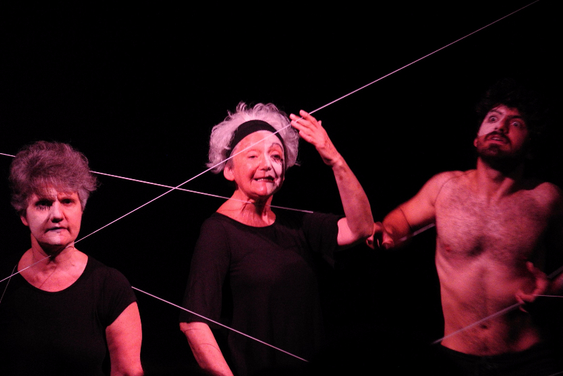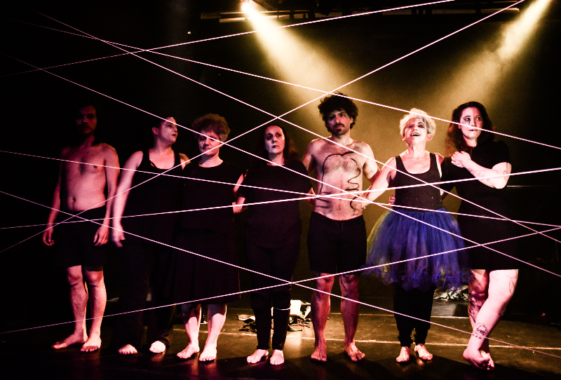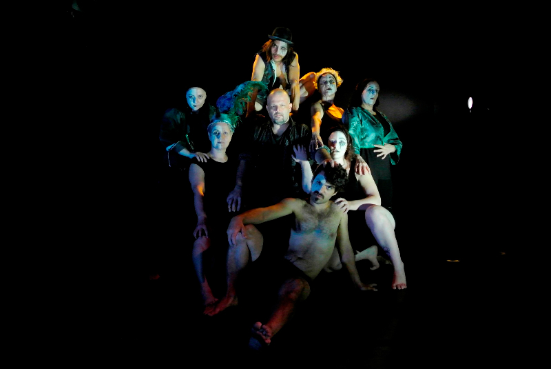 Una obra coral, performática, audaz y semiótica. Una pieza teatral que se funde en un abundante trabajo físico con una multiplicidad de máscaras que mutan entre penumbras.