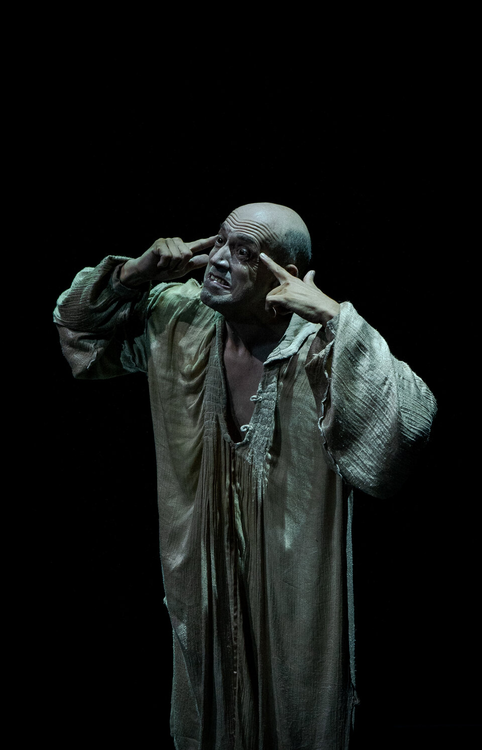 Escenario austero a lo Grotowski: una pequeña mesa, un espejo estallado en su borde y marco de retrato que el inmenso actor mueve según las circunstancias enganchando y desenganchando de unas largas cadenas, dan majestuosidad a la obra.