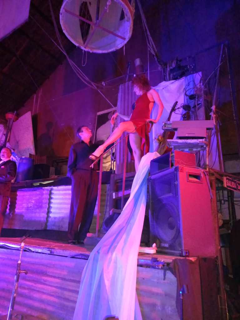 Hernán: vengo de un pasado violento entonces, tomó a mi padre como un personaje porque la verdad es un personaje que a mi me llama la atención y lo retrató en el “El amor desolado”. Hablo con Cari para saber si ella está de acuerdo, le propongo el personaje, se lo propongo a los chicos, no es exactamente idéntico a mi padre, pero está inspirado en él, él se comportó mil veces así, lo tengo en un vago recuerdo, y me instó a tratar el tema de la violencia de género. En este caso llevamos la escena típica del machista que se enamora de una chica y ella se enamora de otro, y se engendra violencia. Lamentablemente, sigue pasando en las relaciones y detrás de todo eso, viene el mensaje de #niunamenos en el personaje de Catalina, decidimos llevar adelante cuadros con mensajes sociales, es nuestra creación más el talento del grupo y lo que le fueron sumando con su impronta personal.