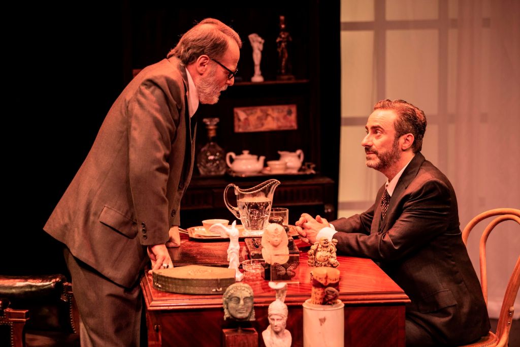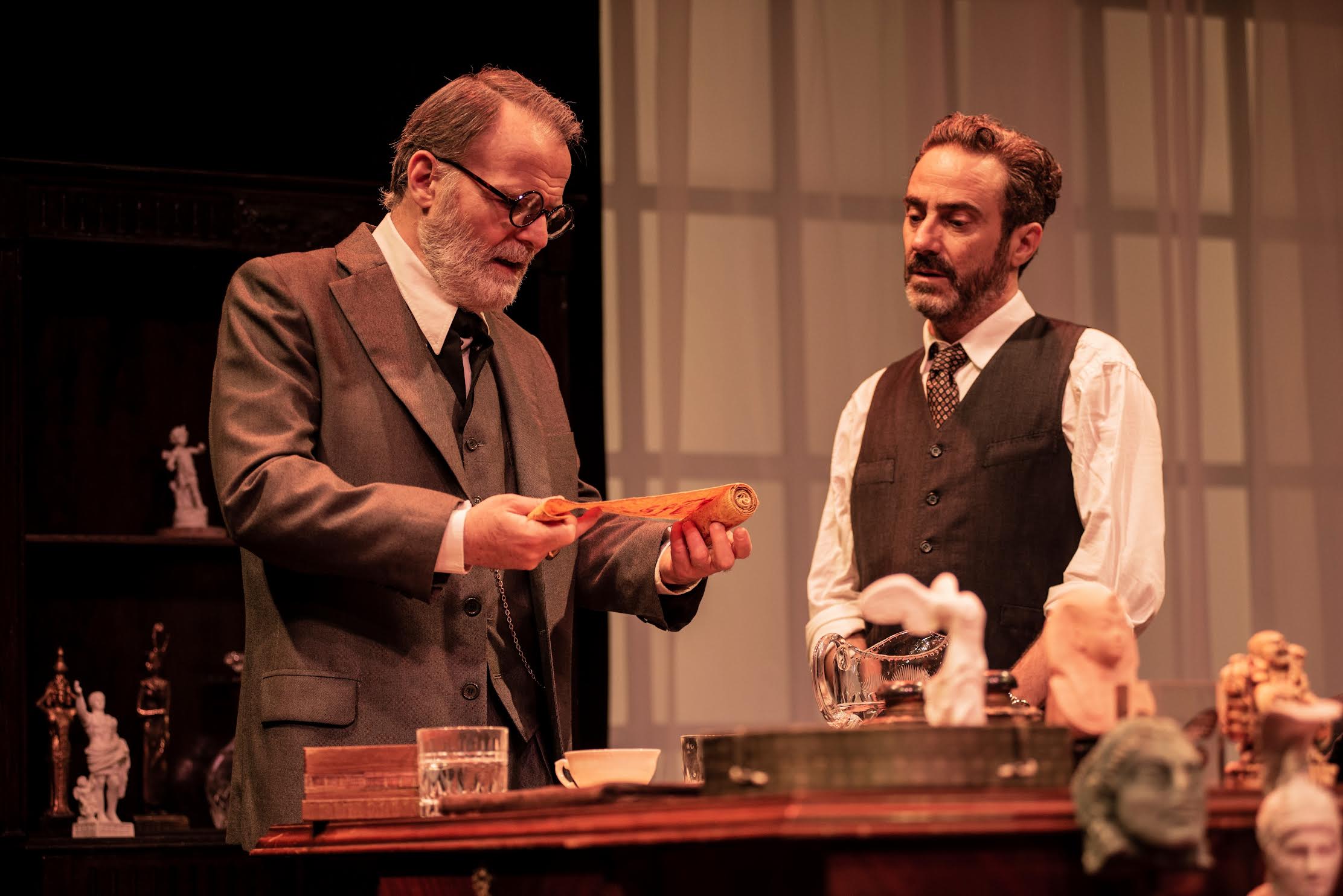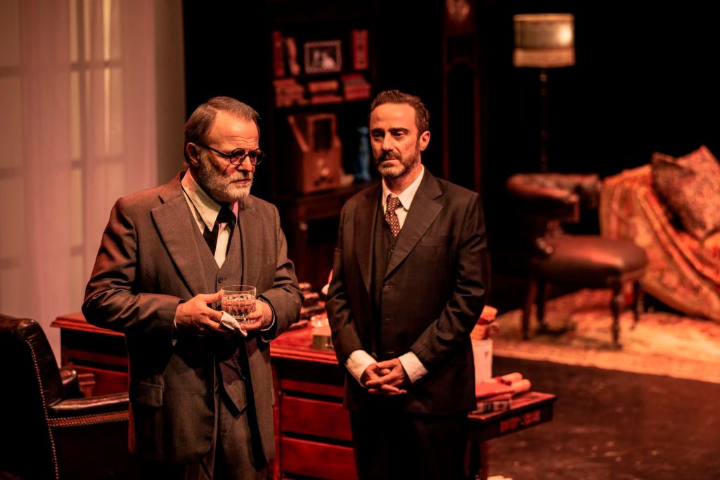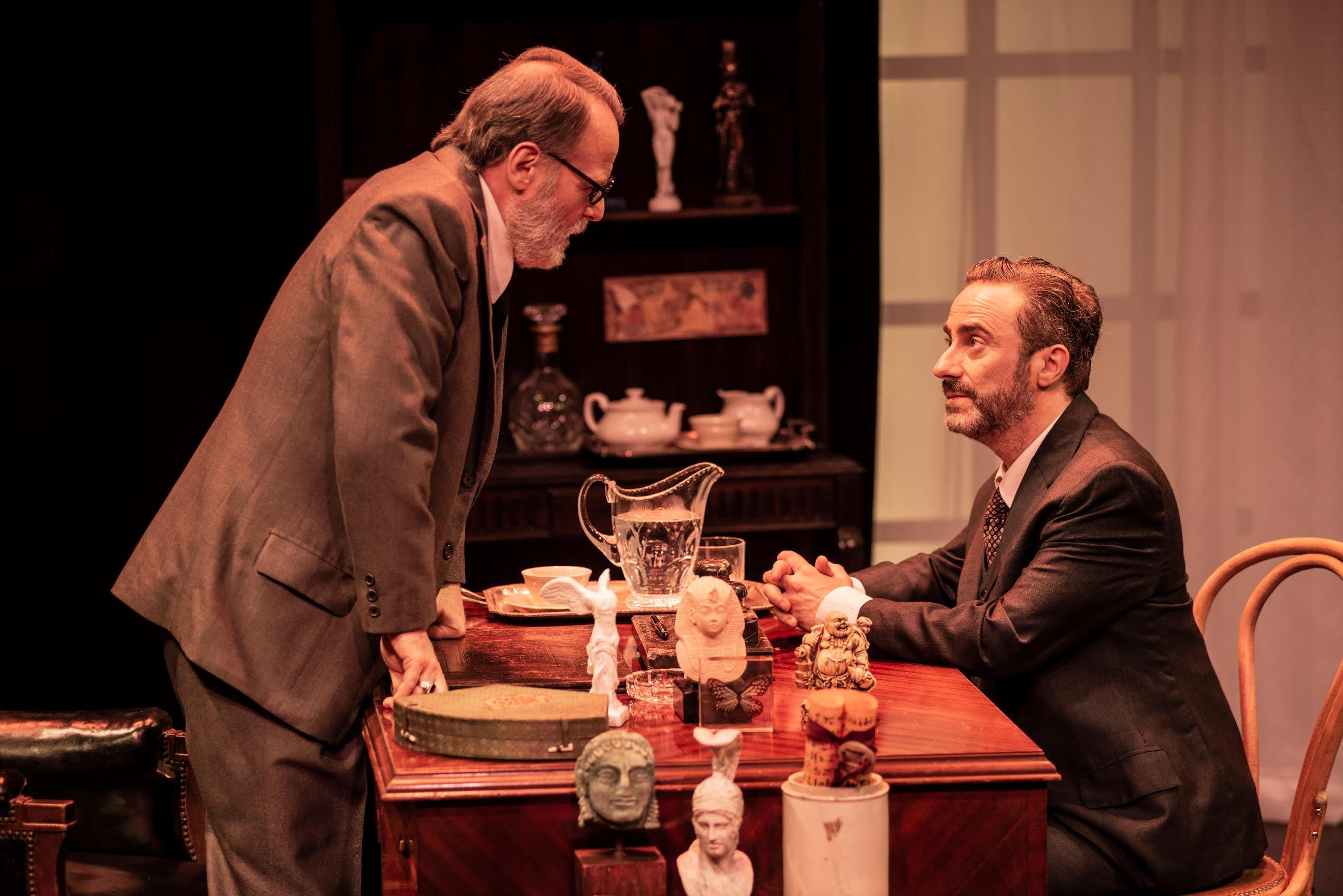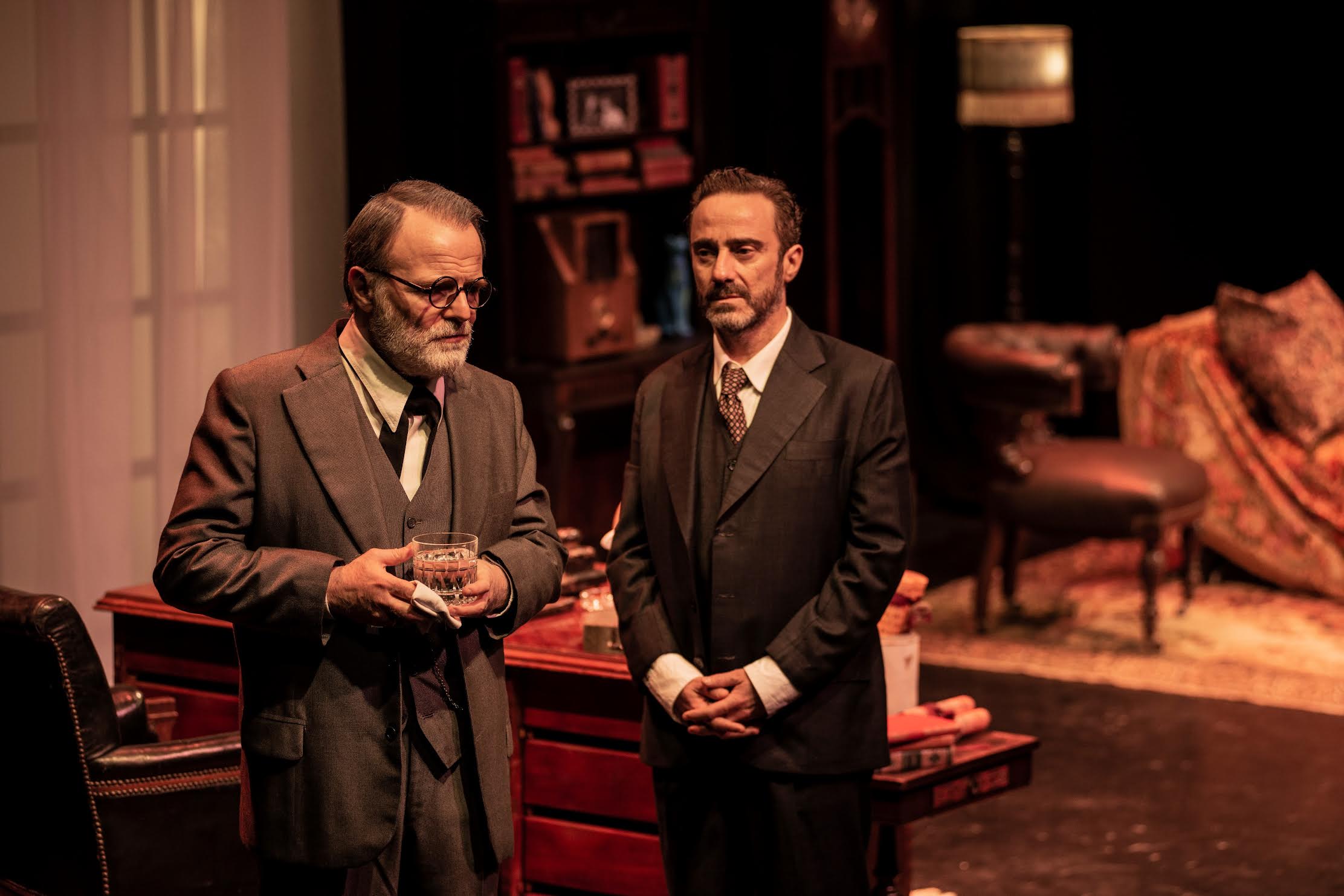 El interjuego entre este peculiar Freud y Lewis bordea con muchísimo humor la cuestión de cuál de los dos podría llegar a ocupar el diván en medio de una especie de complicidad que se engendra en ese diálogo. Diego Siliano contribuye enormemente a que los espectadores entremos en la escena, reproduciendo el mobiliario con todos sus detalles de arte del consultorio que Freud tenía en Viena y que Marie Bonaparte ayudó a que reste intacto al exiliarse a Londres. Muy interesante los momentos donde las problemáticas edípicas se ponen en juego y le otorga a un texto de amplia densidad intelectual, una aplicación práctica y a la vez, teatral de la teoría freudiana.