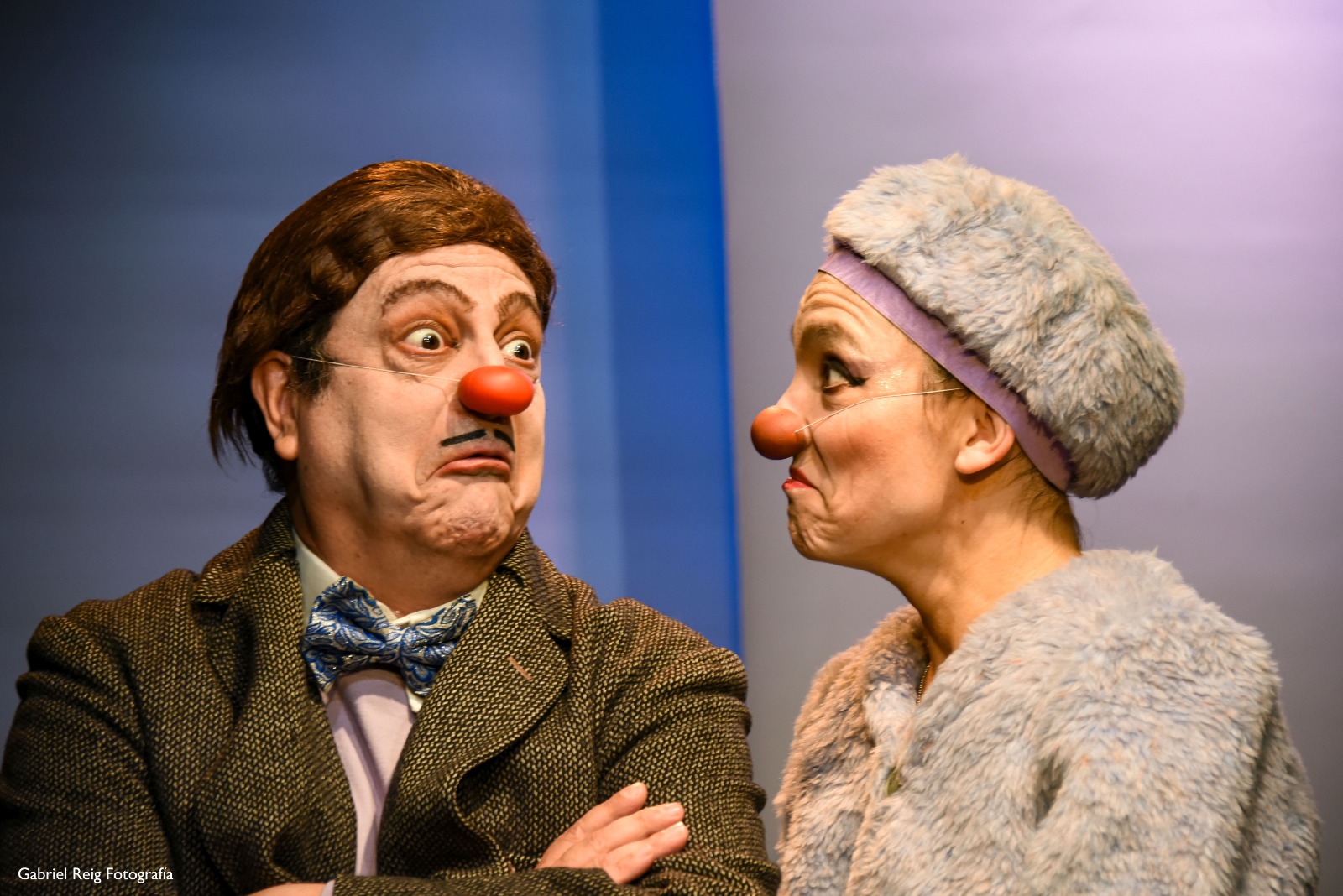 Apenas estoy fuera de la obra tomando un café y me percibo en un estado de sensibilidad en el que puedo dudar de todo (de una insignificante acción como levantar la taza) sin juzgar esa duda como una “inseguridad”. Nuestra sociedad nos vende tantas imágenes de poder que en la medida que podemos correr la mirada hacia otras sensibilidades se nos torna más liviano el peso de nuestras máscaras sociales. En ese punto trabaja la técnica del Clown en general, en reconciliarse con lo frágil, incluso con lo ridículo. En exponerse tal cual somos sin juzgar como debilidad o fortaleza, seguro o inseguro el fluir de nuestros sentimientos / pensamientos. Y es en esta obra donde percibo que se ha llevado a un nivel superior esta propuesta, sobre todo, en el personaje del hombre, neurótico, obsesivo o tantos calificativos psicológicos como querramos añadir encajan. Todos los encarna y los lleva a su esplendor. Es imposible no identificarse con las dudas sin sentir una compasión cómica por todo lo que le pasa. A su lado está su antí-tesis en varios sentidos: ¿una mujer extrovertida para un hombre introvertido? Una compañera de diálogo que encarna otros juegos, otro carácter bastante opuesto: muy identificada con el “Estilo” que muestra hacia el exterior.