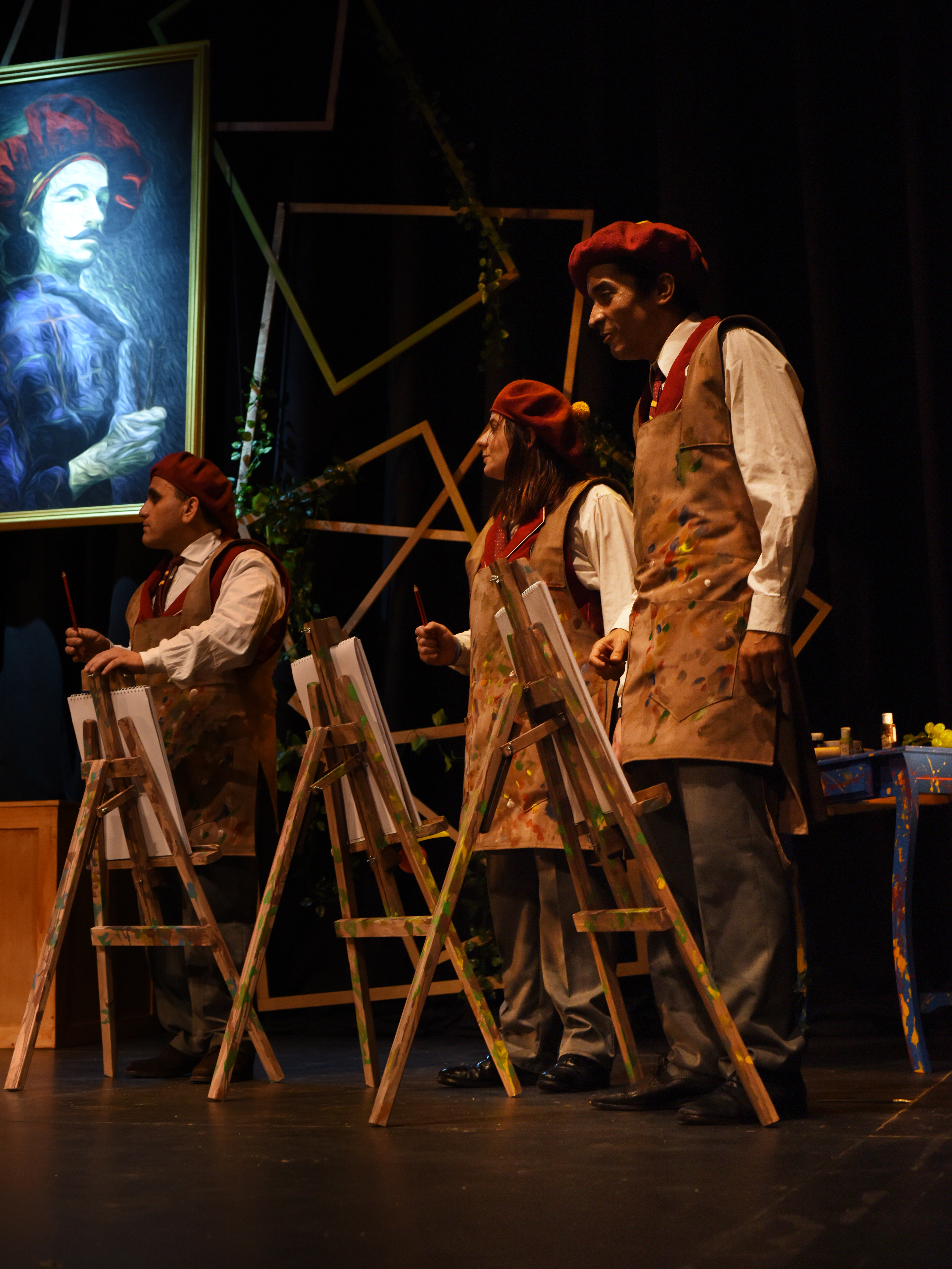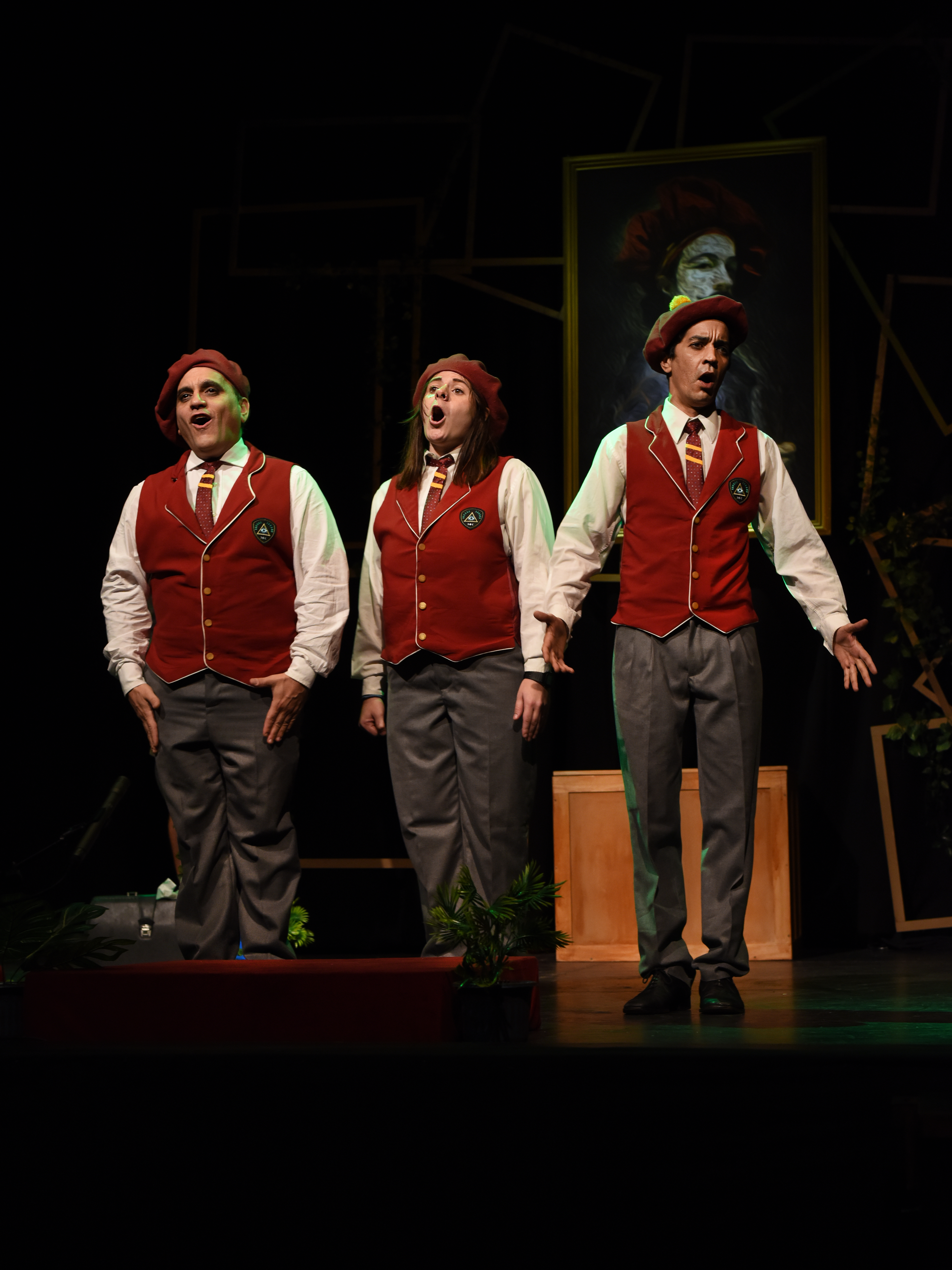 En esta academia de arte, hay un profesor de artes plásticas, en la piel de Julián Lucero que aparece y ya verlo, da risa, sin necesidad de hablar, Manu Fanego encarna al modelo que los alumnos tienen que retratar, y tampoco necesita hablar para hacernos reír con sus poses, ya basta. Manu tiene una transformación admirable en el papel magistral de la Licenciada en Psicopedagogía de esta escuela que está caricaturizada en sus más exquisitos detalles. En el rol de los alumnos estresados por el examen final donde se les entregará el diploma, (si es que logran aprobarlo), está Carola Oyarbide, Tincho Lupus y Pablo Fusco, con un despliegue de todos y cada uno en el escenario destacable y muy dinámico.