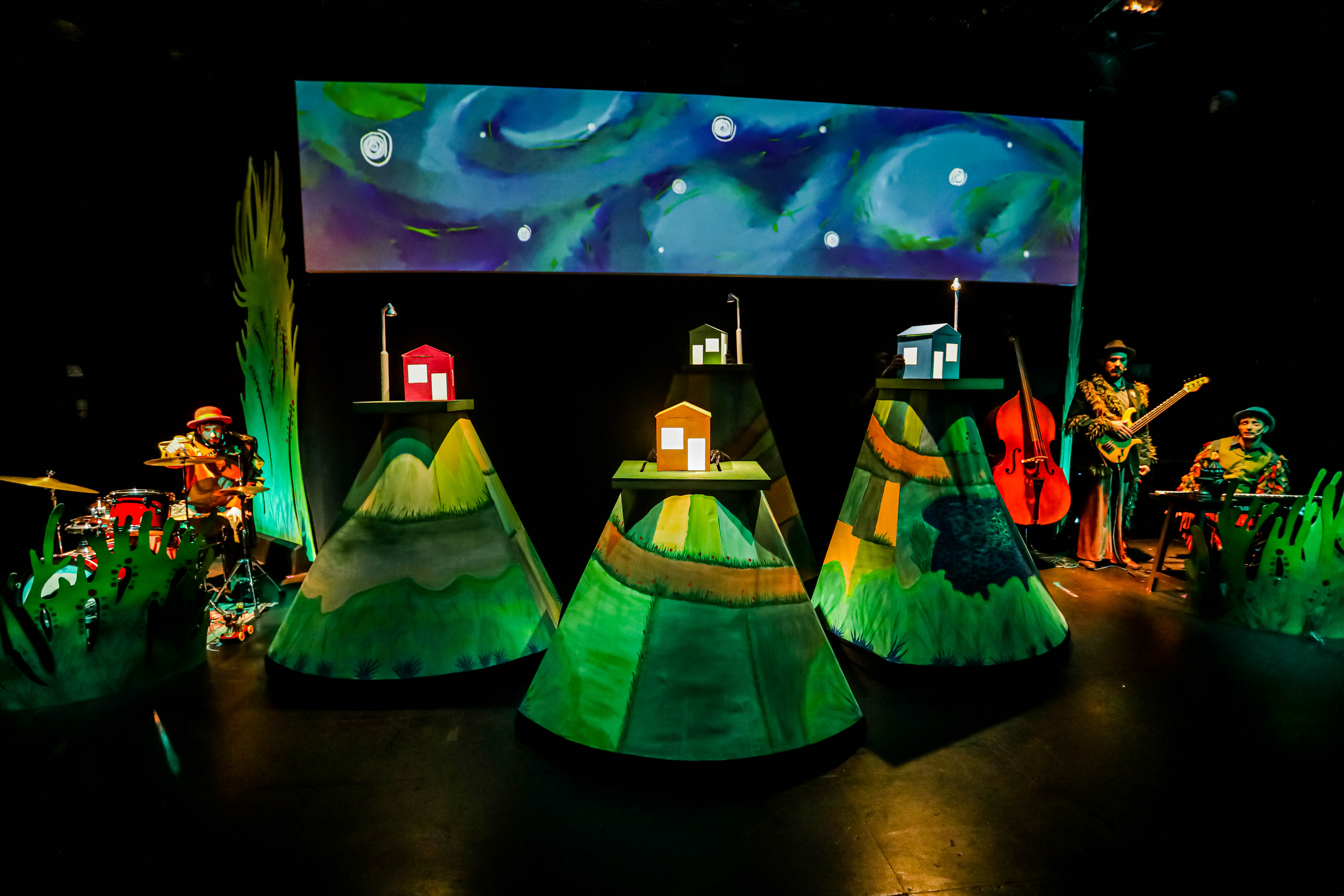 Esta puesta muy atinada para niños pequeños, con maravillosos títeres y músicos en escena tiene, como siempre, varias claves de lectura. Por un lado, una estética que nos remite al cuadro de Van Gogh, La noche estrellada sobre el Ródano; por otro, la pregunta acerca de los miedos de los niños: no se trata de romantizarlos ni de ponerle colores sino de construir modos de acompañamiento que alivien el malestar infantil. Los miedos varían y jamás se enfrentan sin ayuda.