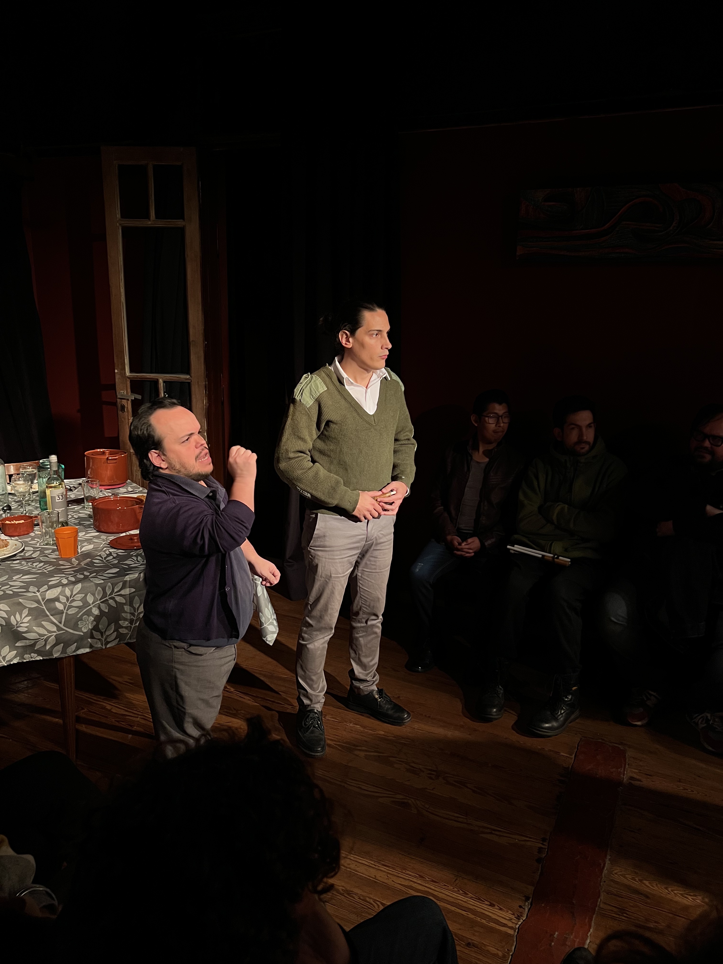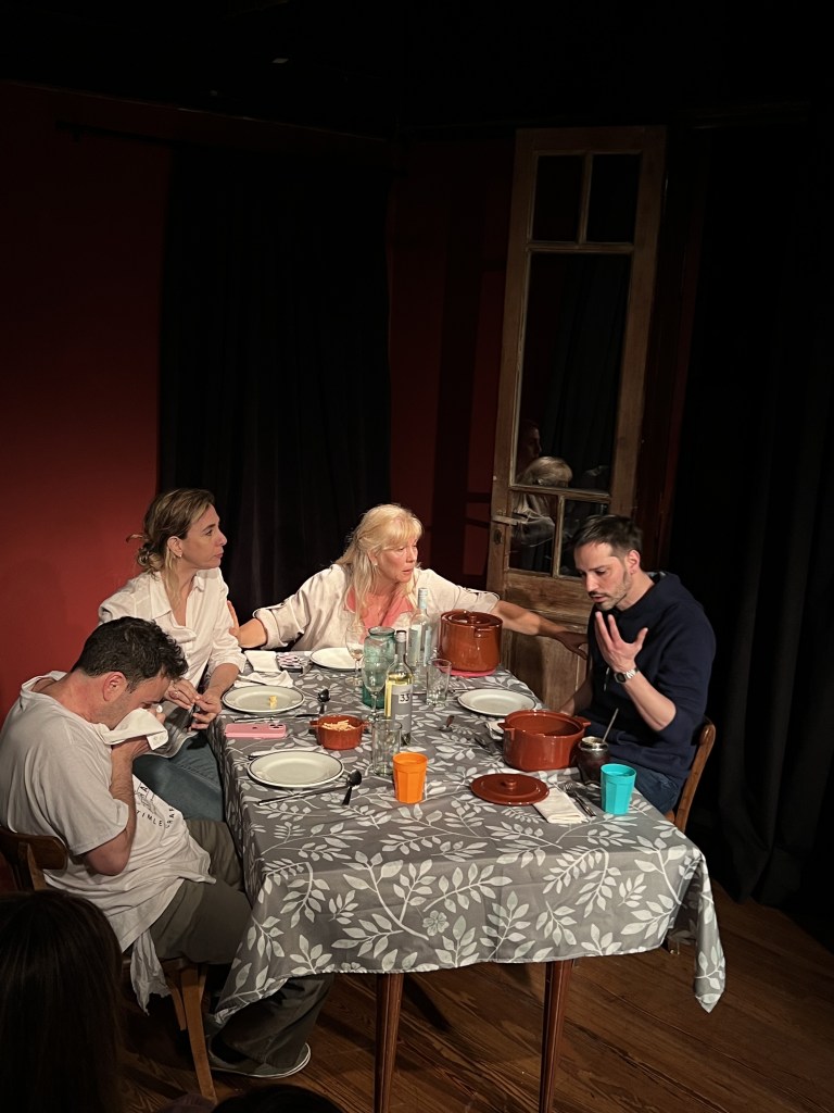 En la sala del Cultural Thames se abre la puerta del living comedor de la casa de los Santillán. Los espectadores tomamos asiento alrededor de ese espacio familiar. Comienzan a ingresar las voces como si estuvieran en la cocina, como en la casa de cualquier familia donde se está preparando la comida y están a punto de almorzar. Los espectadores nos encontramos con cada uno de los miembros de esa familia y tenemos la sensación de convertirnos poco a poco en un integrante más. En esa dinámica donde los vaivenes emocionales nos envuelven, y todo sucede en tiempo real durante el almuerzo familiar, quienes asistimos nos sentimos parte activa de la escena. Y en mi caso, tal como en algunos de los cursos con familias que aceptaban la cámara Gesell, me imaginé supervisando como observadora no participante a Los Santillán, porque ellos me reenvían a algunas de las situaciones que suelen ocurrir en las sesiones familiares. La gran diferencia es que allí, me vi Ingresando sin introducción ni previo aviso, y sin que me consulten, dentro de la intimidad de esta familia que está intentando procesar un duelo. La elaboración de un duelo implica una retracción libidinal y una gran necesidad de nutrirse con amor. Ese amor está simbolizado en el puré con albóndigas que cocinó Inés, la mamá, para almorzar junto a su hermano Horacio, su hijo Juan, su hija Cata, y sus dos nietos.