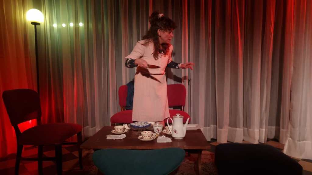Algunos se refieren a esta puesta como a un “unipersonal”, pero el planteo de la dirección de García Lenzi, así como la performance actoral de la protagonista, Valeria Giorcelli, crean el espacio y tres personajes más que van cobrando volumen y dimensión emotiva a medida que transcurre el monólogo solitario, culpógeno y desesperado de la dueña de casa.