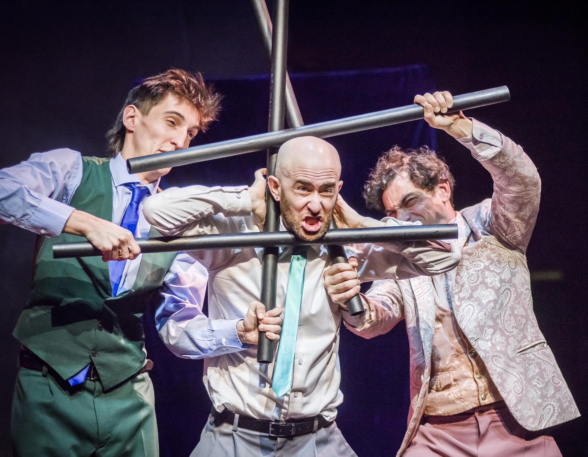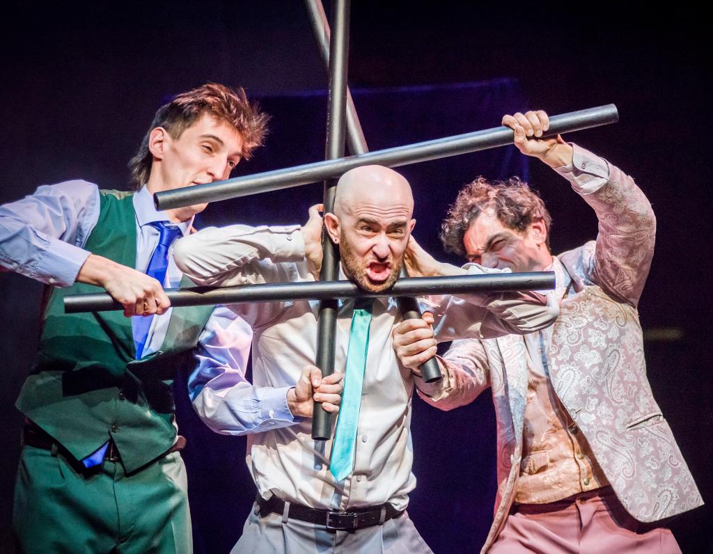 Una puesta que remite, en clave acrobática y clownesca, con los cuerpos de los actores que parecen llegar al límite de su plasticidad y posibilidad de cambio y con la mutabilidad de los objetos en escena, a lo mejor de la comedia física, desde Buster Keaton y Charles Chaplin a Jerry Lewis y Laural y Hardy, pero que la actualiza con recursos técnicos de esta época, filmando y agigantando a los personajes, en una extracción de sentido hasta la última gota. El nombre de la obra, su adaptación a cargo de Gabriel Chamé Buendía, el desempeño de Matías Bassi, Nicolás Gentile, Agustín Soler, Elvira Gómez y Marilyn Petito, cumplen en hacernos pensar (y hacernos exaltar, hacernos reír) en la máxima del Evangelio según San Mateo: “No juzgues si no querés ser juzgado, porque con el juicio que juzgás te juzgarán y con la medida que medís te medirán”.