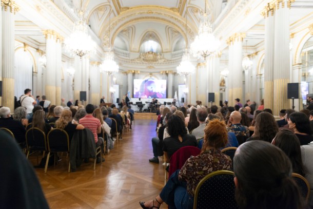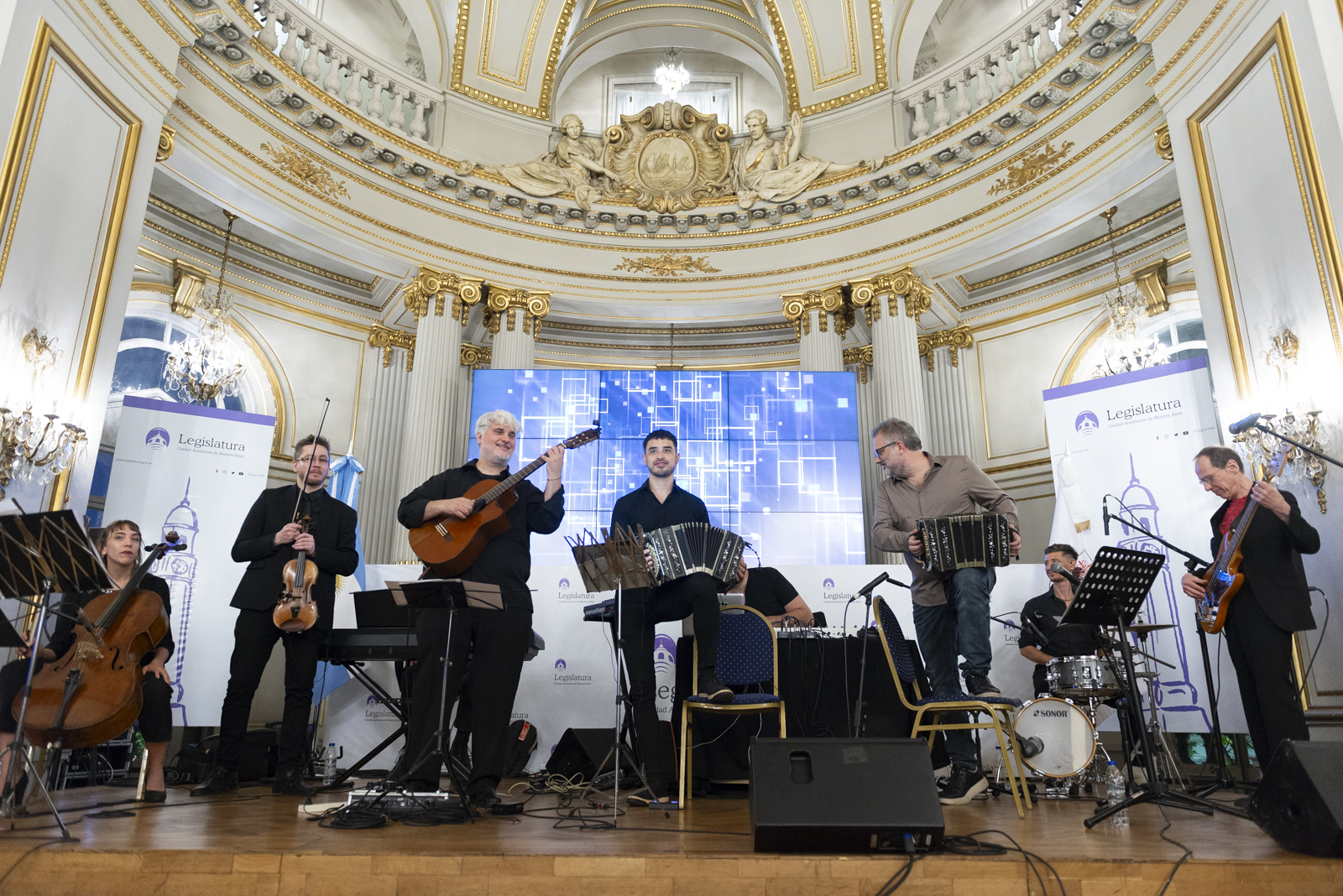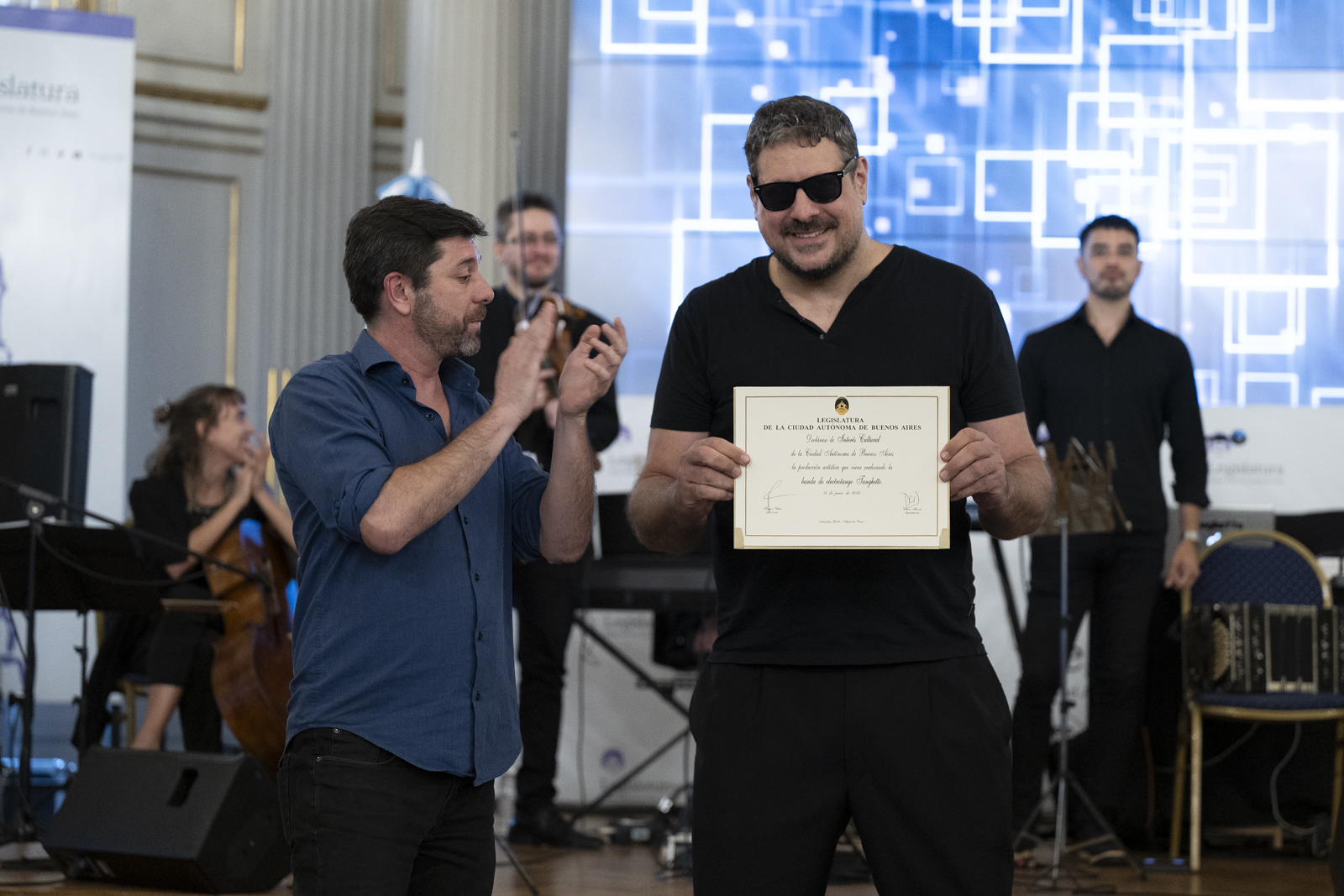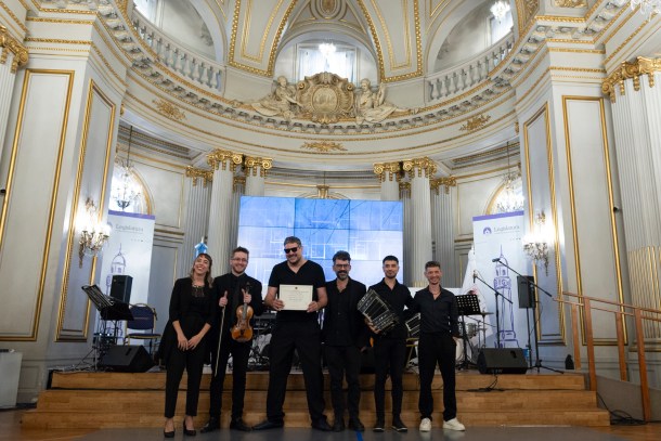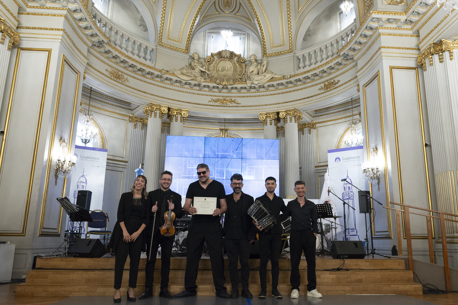 La celebración que tuvo lugar el pasado 3 de abril en la Legislatura porteña que distinguió al proyecto musical de Tanghetto: Personalidad Destacada de la Cultura, y fue altamente conmovedora y sofisticada al mismo tiempo. El lujoso Salón Dorado estuvo colmado de música y fuertes emociones que nos envolvieron a todos los presentes sobre todo al momento de recibir el galardón. Los ovaciones fueron muy sentidas en ese glorioso instante en que Max Masri baja del escenario a recibir esta distinción y todos los músicos de la banda observan al público muy emocionados.