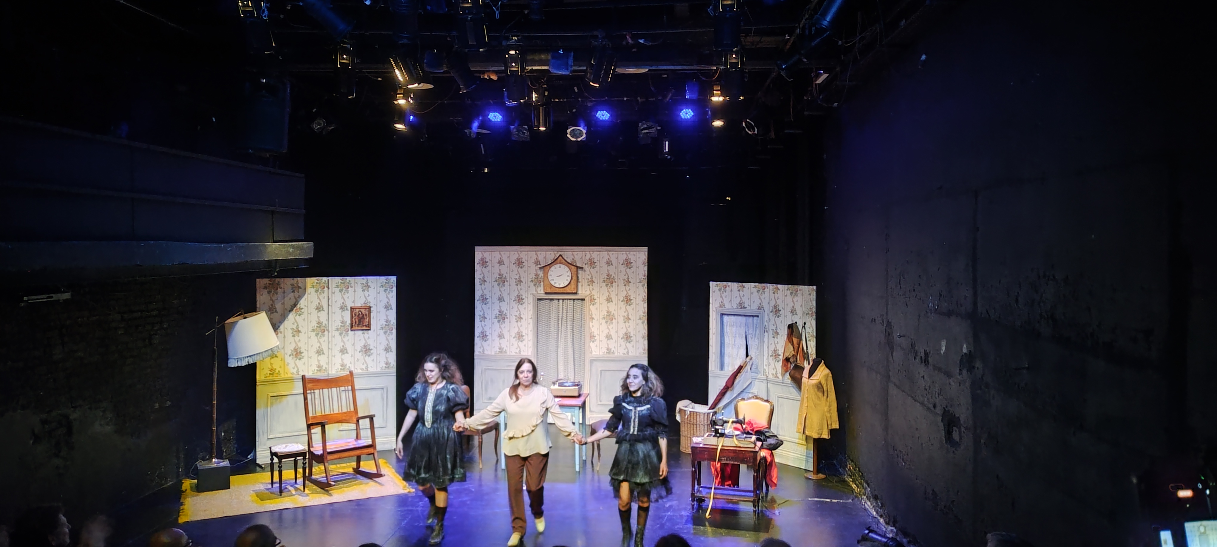 En otro plano, un escenario con mesa, sillas (pocas), una lámpara de pie que se enciende y se apaga misteriosamente, una ventana, una puerta y una máquina de coser y el infaltable reloj de pared, todo viejo, enmarcan esta historia en torno a alguien que no aparece jamás pero está presente todo el tiempo: el verdadero victimario, el hombre vestido con traje negro, esposo de la modista, que engañaba a sus victimas.