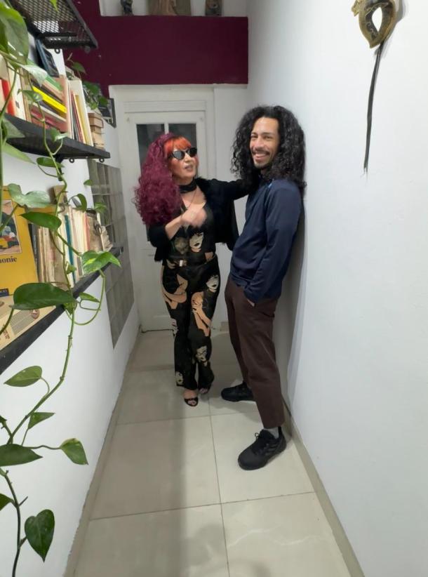 Está inspirada en mi abuela materna, ese es otro tema, tenía esclerosis múltiple, yo nunca la vi caminar. Nosotros estábamos en Costa Rica en ese momento que le apareció la enfermedad porque mi mamá tenía una beca, y volvimos a Bolivia. Mi abuela vivió en mi casa. Ella tenía su lugar en casa con enfermeras, con todo…Vivió así hasta hace unos años que murió mientras yo vivía acá. Fue muy aliviante cuando se murió, no te voy a mentir. Lo peor es que a ella la fé la mantenía viva pero sufrían los demás, sí. Es un horror pero a la vez comprendo, qué sé yo. A ella le encantaba bailar antes de tener esta media muerte. Ella era muy bailarina, se vestía loca en las reuniones familiares y entraba bailando. El chal que uso en la obra era de mi bisabuela Rosalía, la mamá de Gladys, que enfermó de esclerosis múltiple medio año antes de mi nacimiento, en el 96 aproximadamente. Yo pasaba mucho tiempo con ella, viendo la tele y cosas así. Mis dos abuelas fueron las primeras en llevarme al travestismo de base. Mi abuela paterna no vivía en la casa, nos veíamos solo los fines de semana. Pero igual, las dos me compraban Barbies a escondidas, y llegué a tener toda una colección de Barbies a ocultas. Hubo un episodio sobre las Barbies. En dos o tres ocasiones, amigos, primos en cumples, las descubrieron y obviamente se burlaron, eso estaba en el menú.