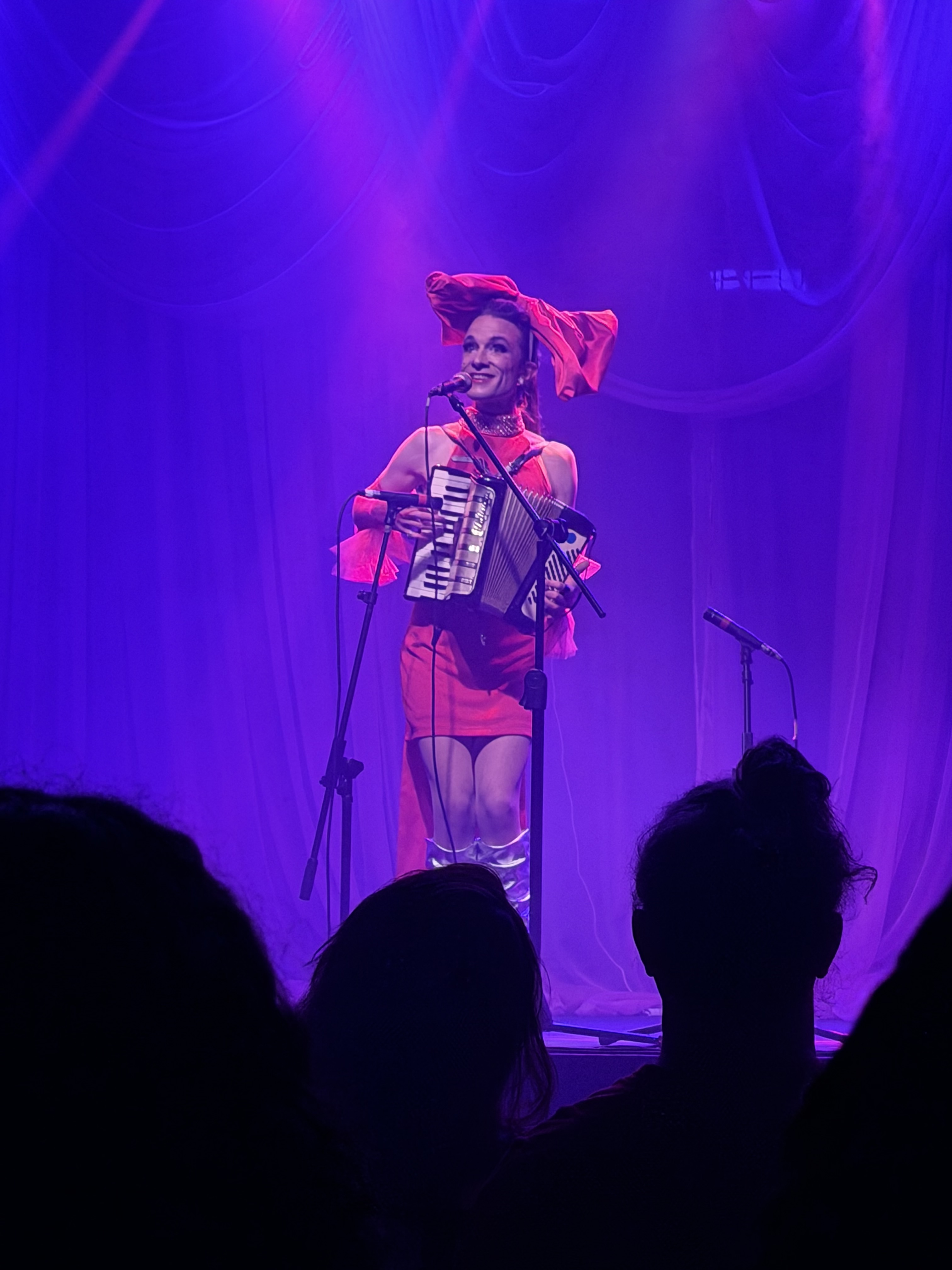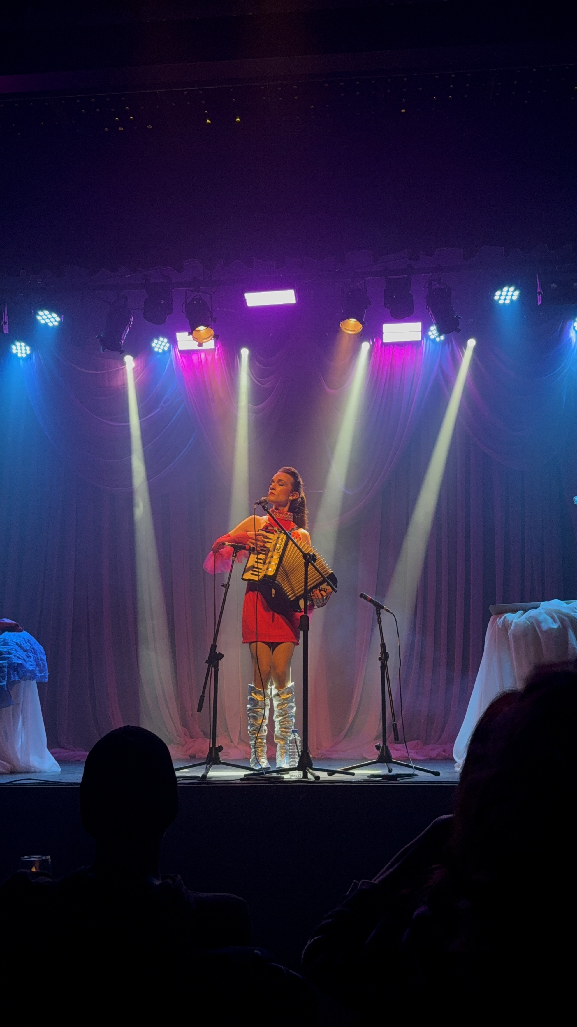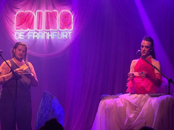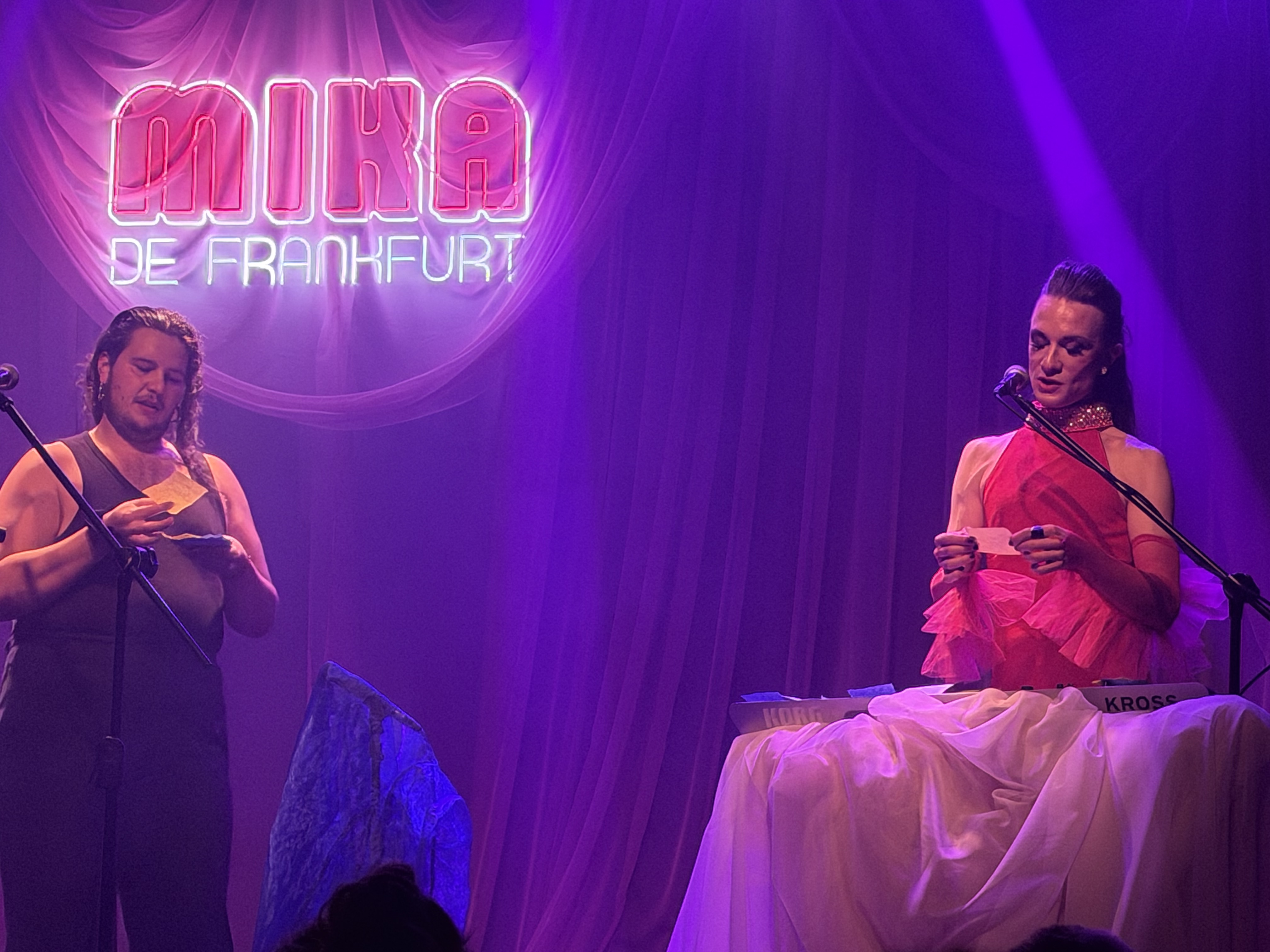Fanego toca el acordeón y el piano, con el que improvisa canciones a partir de la propuesta de escribir un deseo en papelitos, – que lee Thefs en el escenario- puestos en las mesas, para luego cantarlos. Así, su Mika de Frankfurt enlaza frases como “quiero paz”, “tener novio”, “que la plata alcance», «viajar”, entre tantos otros deseos devenidos canciones.