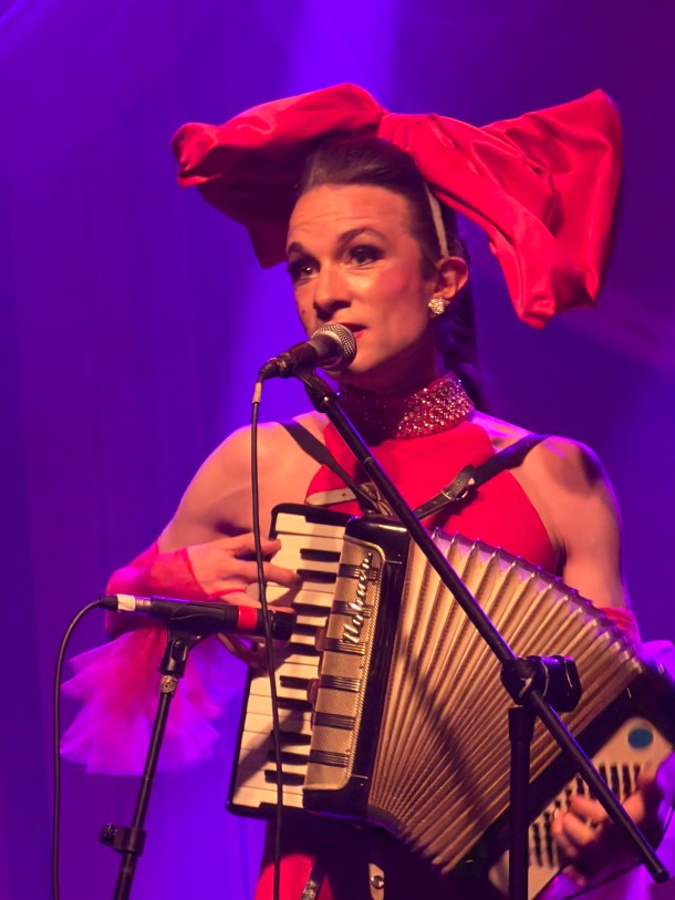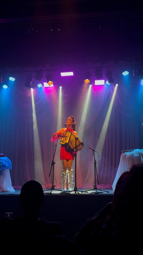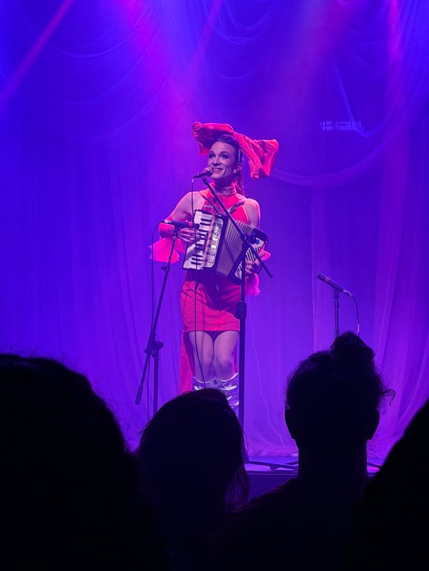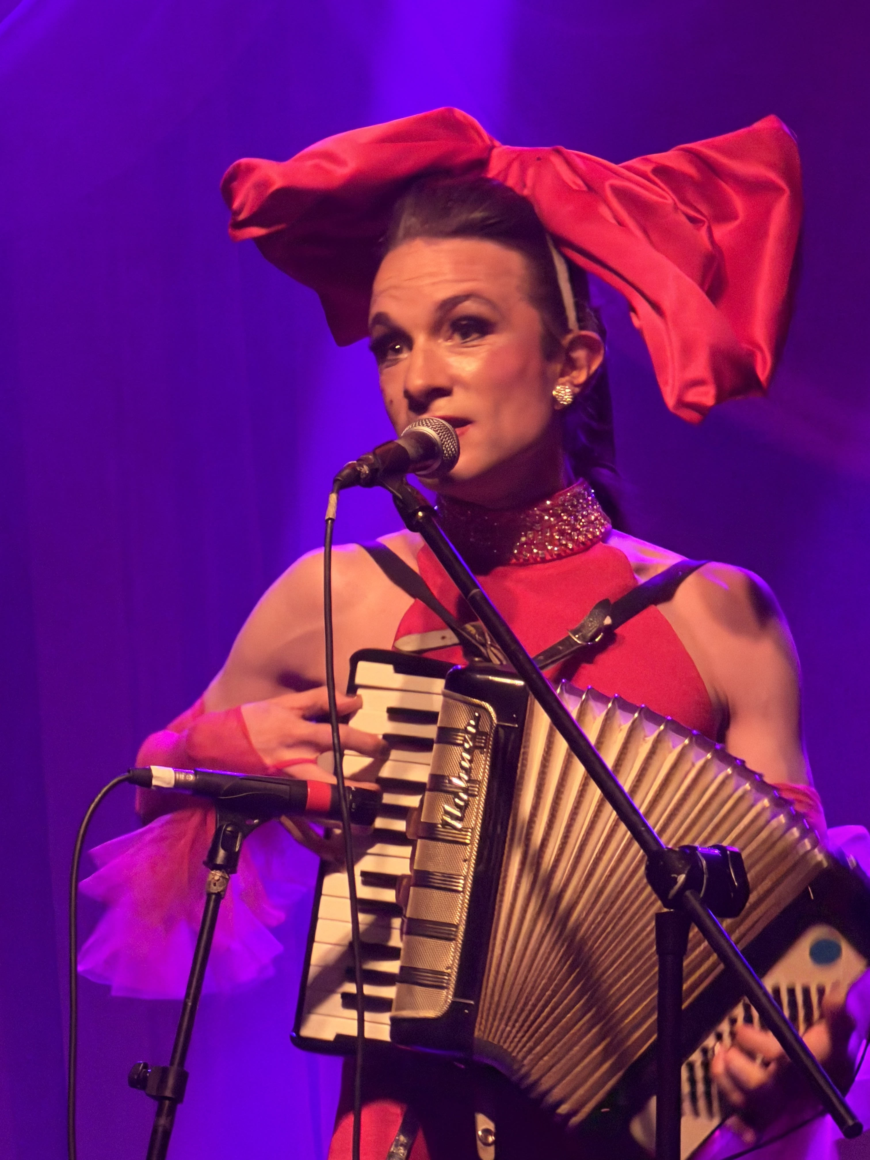 Fanego toca el acordeón y el piano, con el que improvisa canciones a partir de la propuesta de escribir un deseo en papelitos, – que lee Thefs en el escenario- puestos en las mesas, para luego cantarlos. Así, su Mika de Frankfurt enlaza frases como “quiero paz”, “tener novio”, “que la plata alcance», «viajar”, entre tantos otros deseos devenidos canciones.