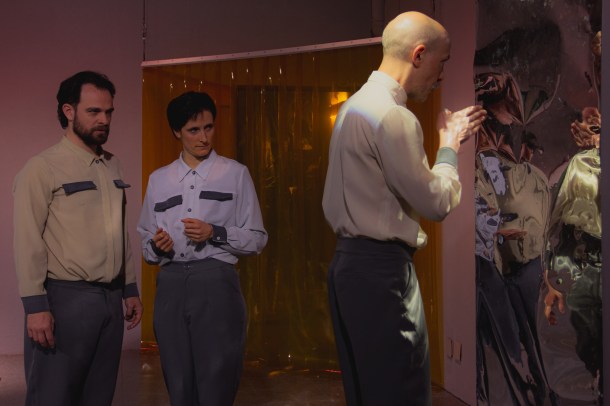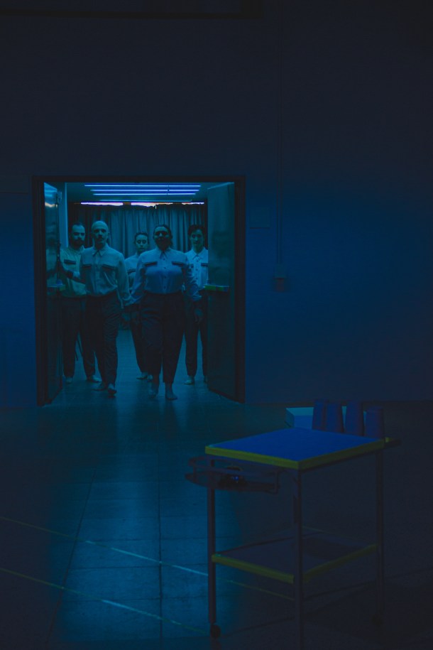 Futurística, crítica, estética: “KALMA – nadie puede ser feliz” es un “programa experimental de estabilización emocional para la vida en sociedad”, como dicen las instrucciones que nos dan a los espectadores antes de entrar a la función. Y uno entra en un mundo paralelo en un instante, gracias a la espacialidad, sonoridad, iluminación, escenografía, vestuarios, fiscalidades, actuaciones: todo está perfectamente pensado y genera que uno entre en la ficción con sólo atravesar la puerta. Un mundo blanco de control estatal, que busca dar soluciones efectivas al “problema” de sentir, nos atraviesa en tanto es una hipérbole de la “educación emocional” contemporánea, que fija recetas y fórmulas para controlar y moldear a las personas y los cuerpos para hacerlos funcionales a la sociedad.