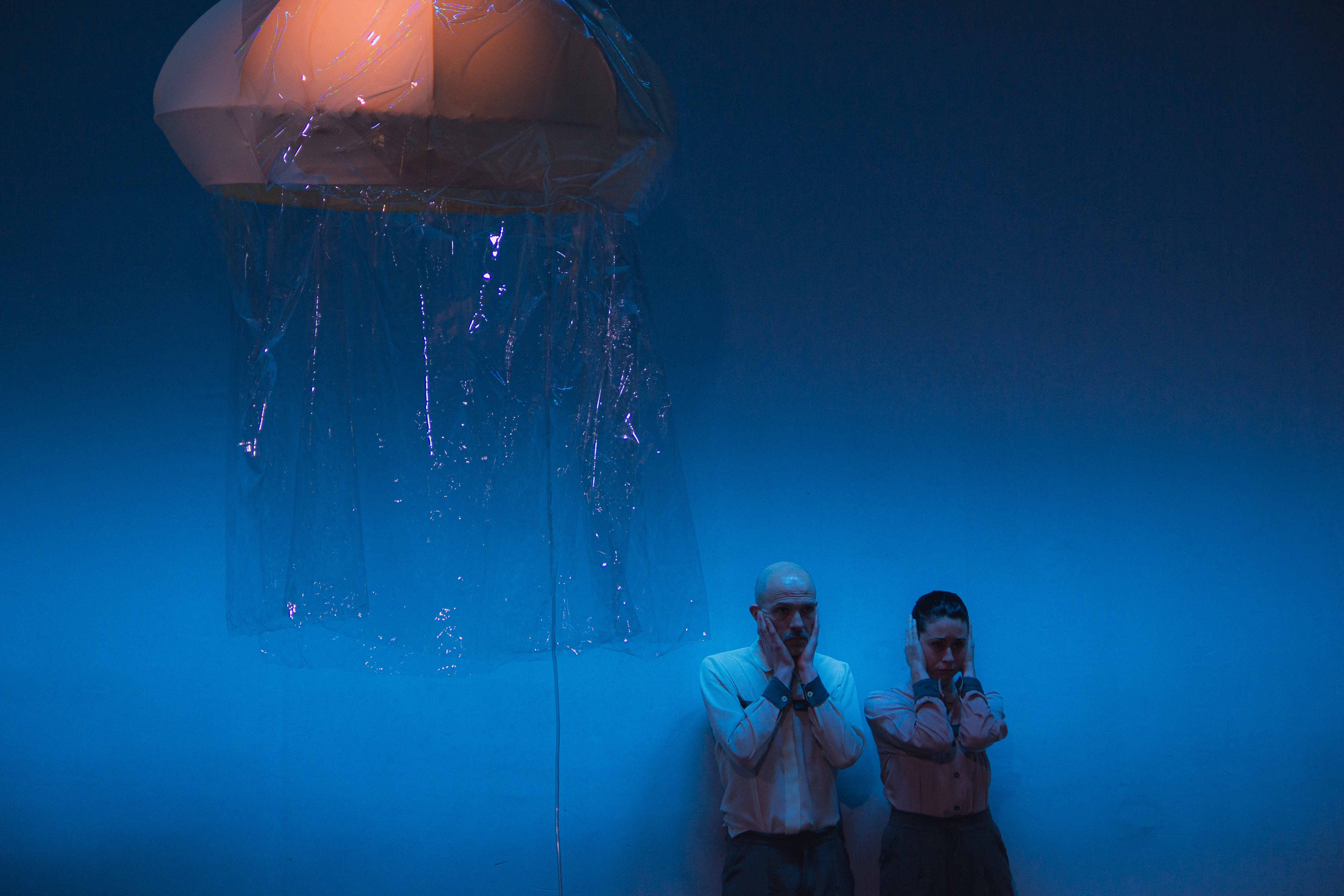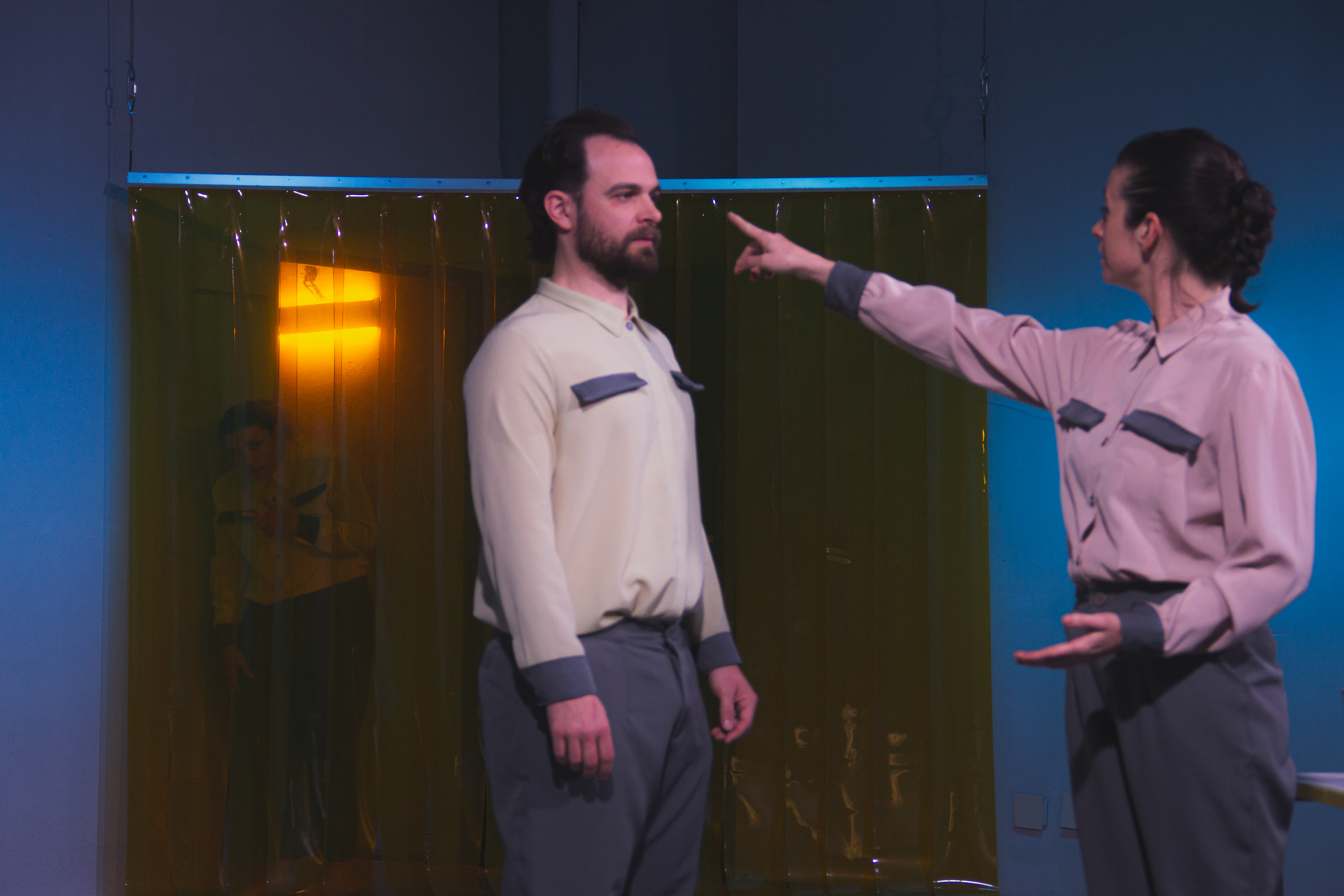 Futurística, crítica, estética: “KALMA – nadie puede ser feliz” es un “programa experimental de estabilización emocional para la vida en sociedad”, como dicen las instrucciones que nos dan a los espectadores antes de entrar a la función. Y uno entra en un mundo paralelo en un instante, gracias a la espacialidad, sonoridad, iluminación, escenografía, vestuarios, fiscalidades, actuaciones: todo está perfectamente pensado y genera que uno entre en la ficción con sólo atravesar la puerta. Un mundo blanco de control estatal, que busca dar soluciones efectivas al “problema” de sentir, nos atraviesa en tanto es una hipérbole de la “educación emocional” contemporánea, que fija recetas y fórmulas para controlar y moldear a las personas y los cuerpos para hacerlos funcionales a la sociedad.